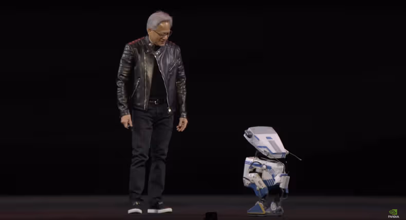 Blue isn't just a crowd-pleaser—it represents a groundbreaking collaboration between Nvidia, Google DeepMind, and Disney Research. The robot contains two Nvidia computers and showcased impressive mobility as it walked around Huang, beeping and nodding its head in response.